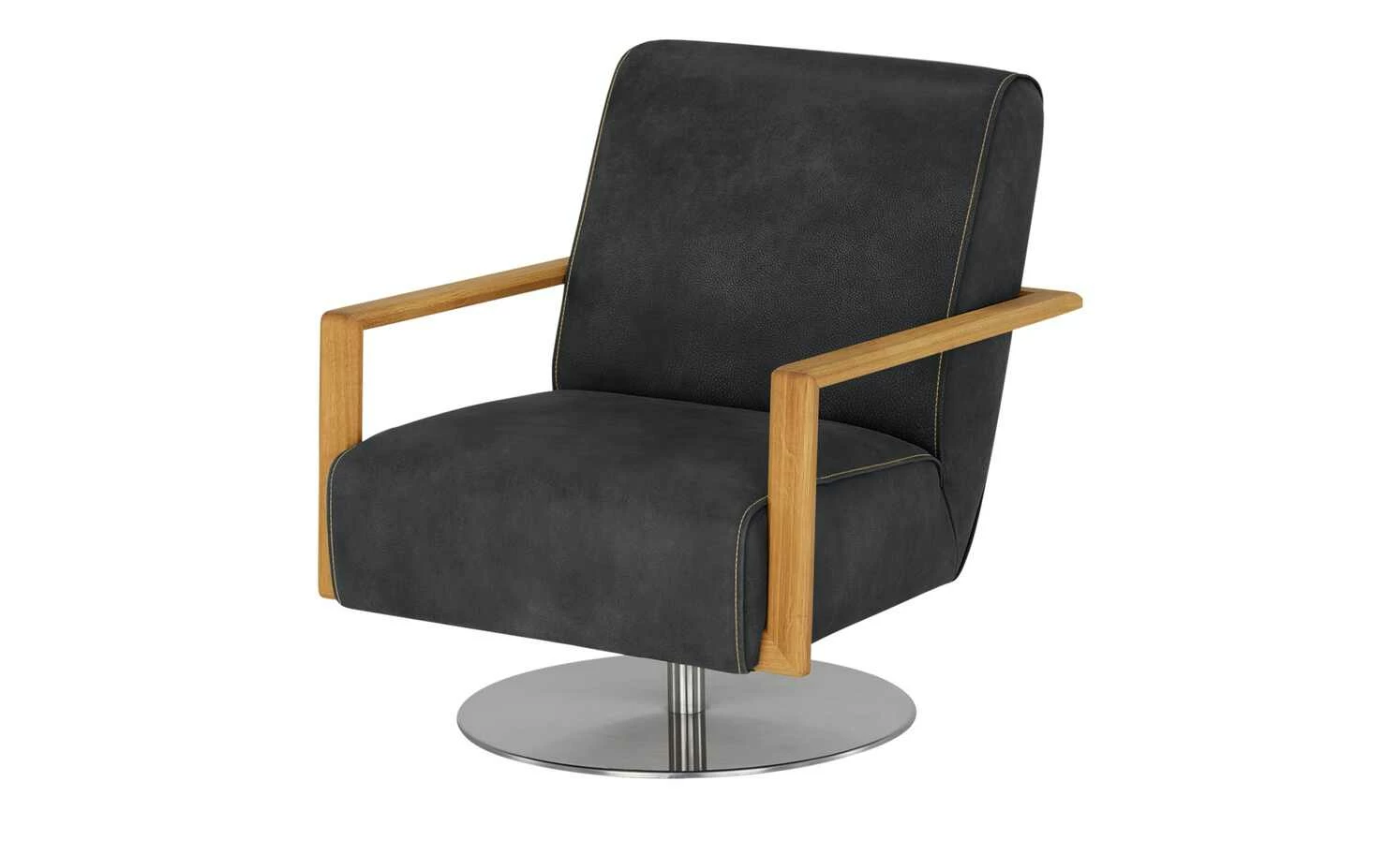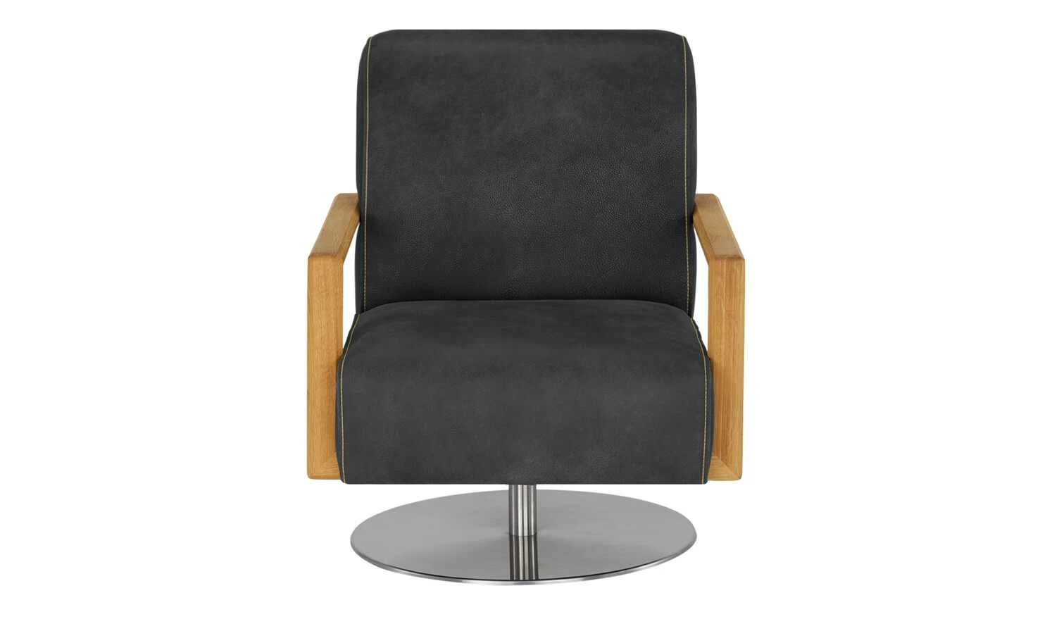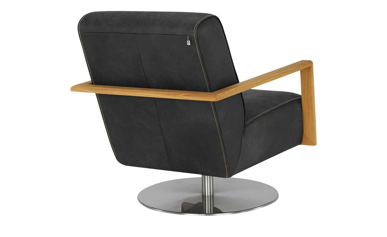 Erleben Sie Handwerkskunst und höchsten Komfort: Beim Sessel Icarus harmonieren verschiedenste Materialien miteinander. Klare Linien und liebevoll gearbeitete Details bestimmen dabei das Design des Sessels. Starke Massivholz-Arme aus geölter Wildeiche umarmen das weiche Lederpolster. Hochwertiges Büffelleder umspannt den gesamten Sessel und verleiht Icarus einen zeitlos-modernen Touch. Der dekorative Keder und die Kontrastnaht setzen attraktive Akzente. Getragen wird der Sessel von einem edlen Drehfuß aus satiniertem Nickel.