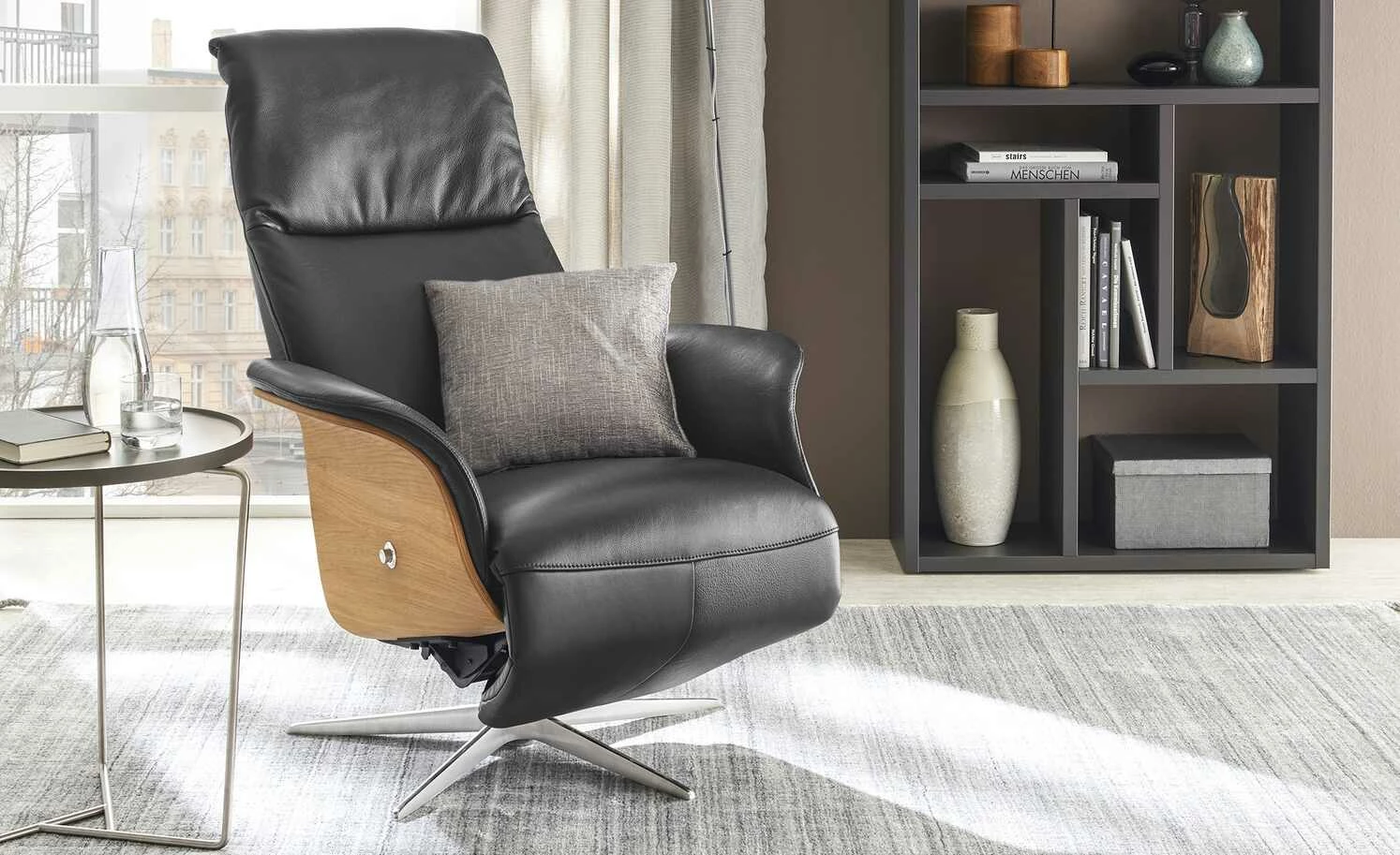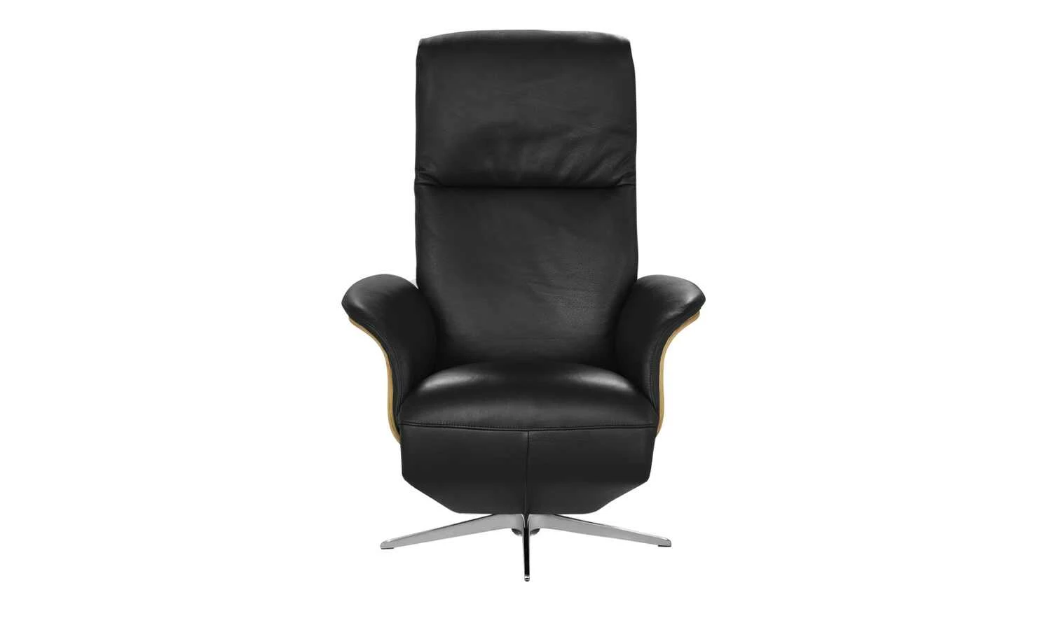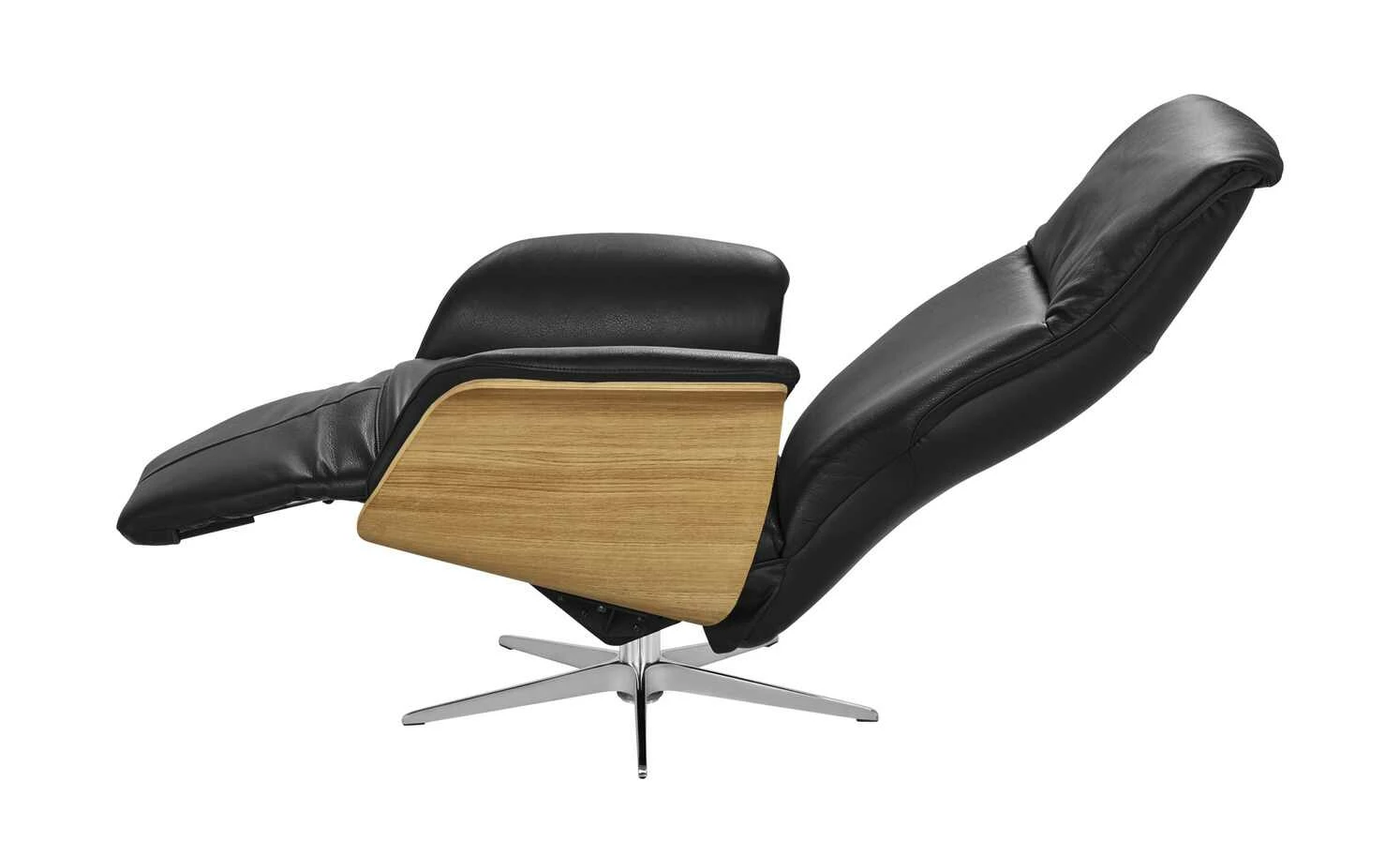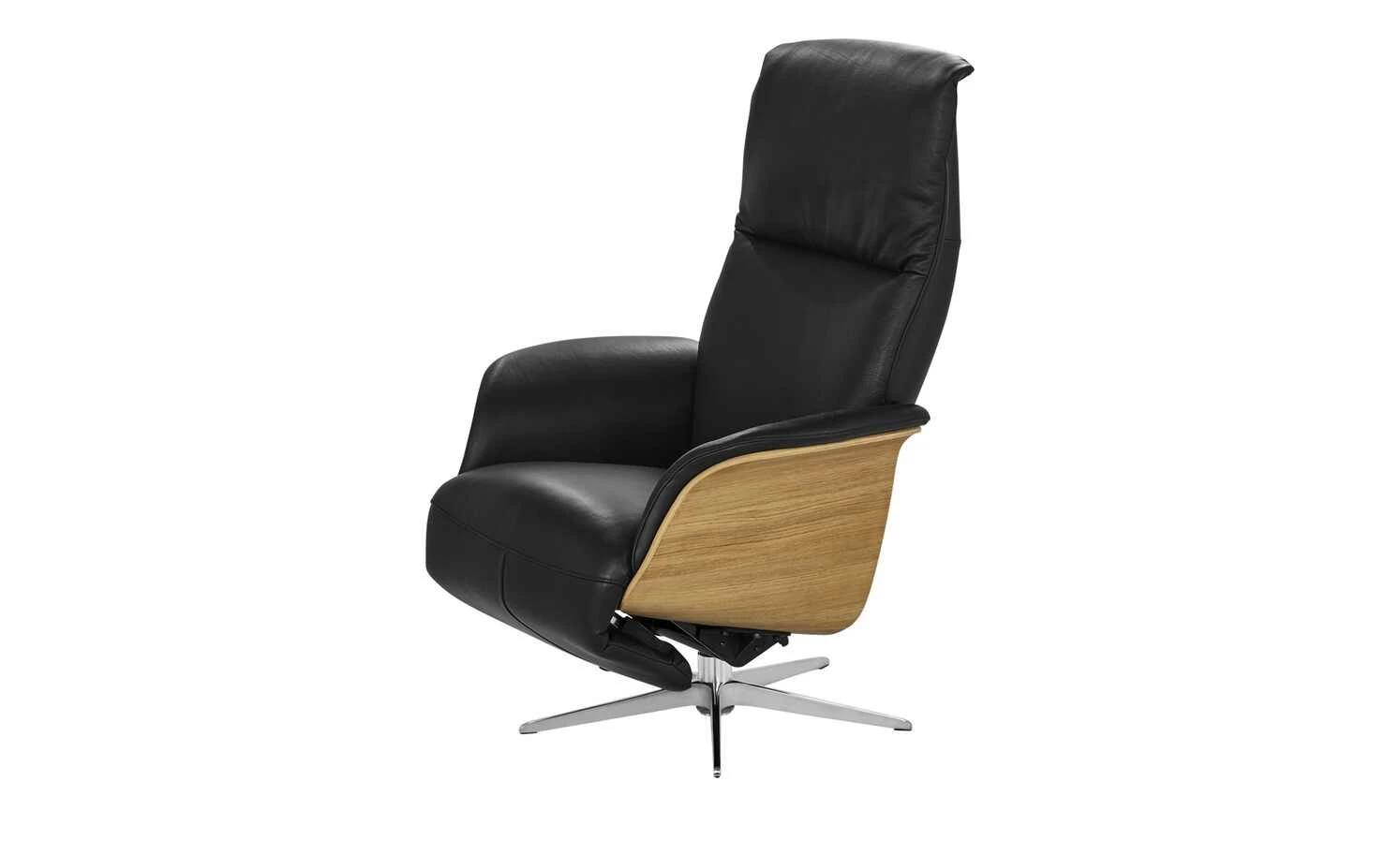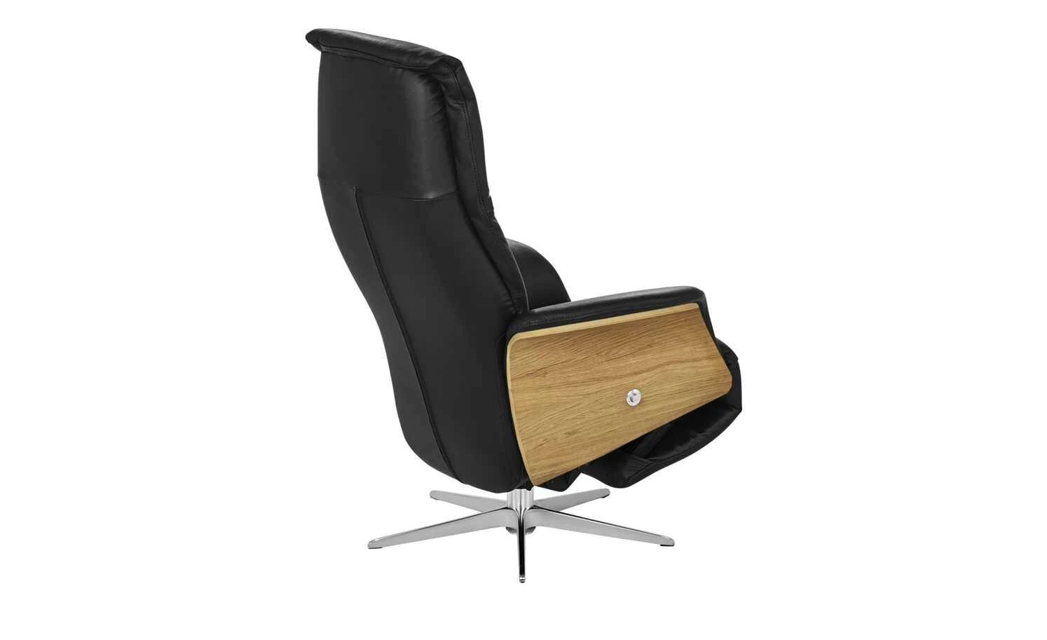 Zum Lesen, Entspannen oder für ein kleines Nickerchen eignet sich der Relaxsessel Frederick. Der Korpus ist mit Kunstleder bezogen. Sitzfläche und Rücken mit hochwertigem Echtleder. Die Holzschale samt Armlehnen besteht aus massiver Eiche. Das Holz setzt sich schön vom Lederbezug ab. Der Sessel steht sicher auf einem sternförmigen Fußteil aus Metall. Frederick ist drehbar und mit einer manuellen Relaxfunktion ausgestattet. So können Sie die Fußstütze und Rückenlehne verstellen. Das angenehme Sitzgefühl wird dank Wellenunterfederung und Kaltschaumpolsterung noch besser.