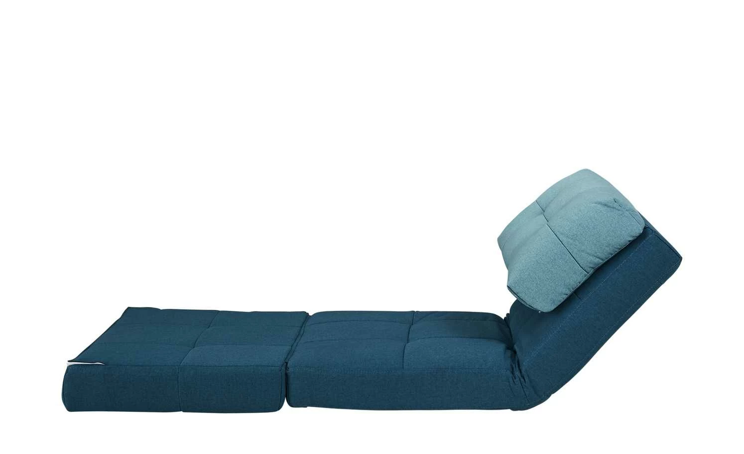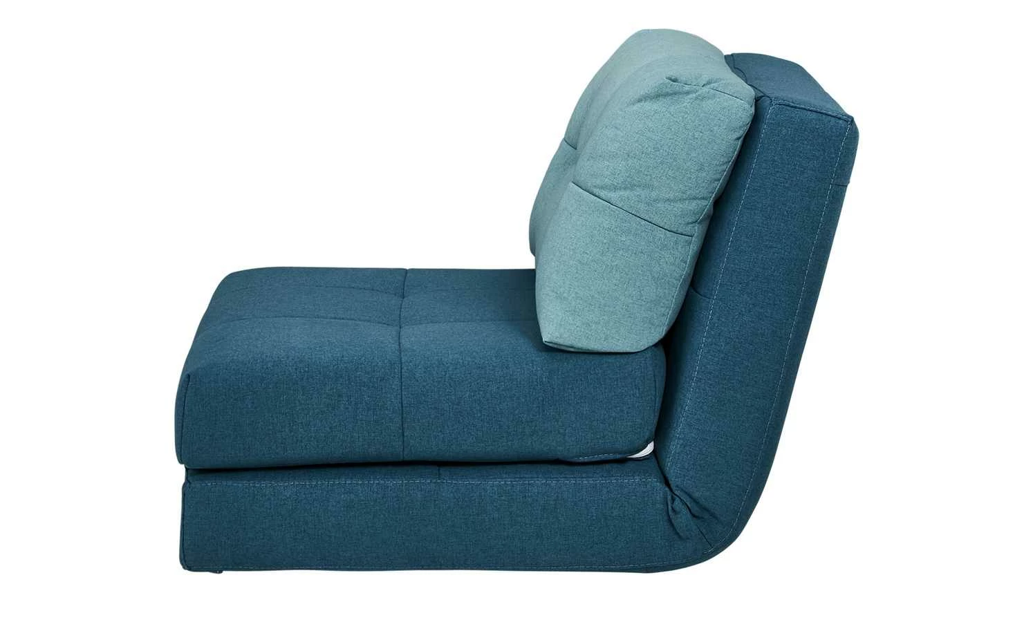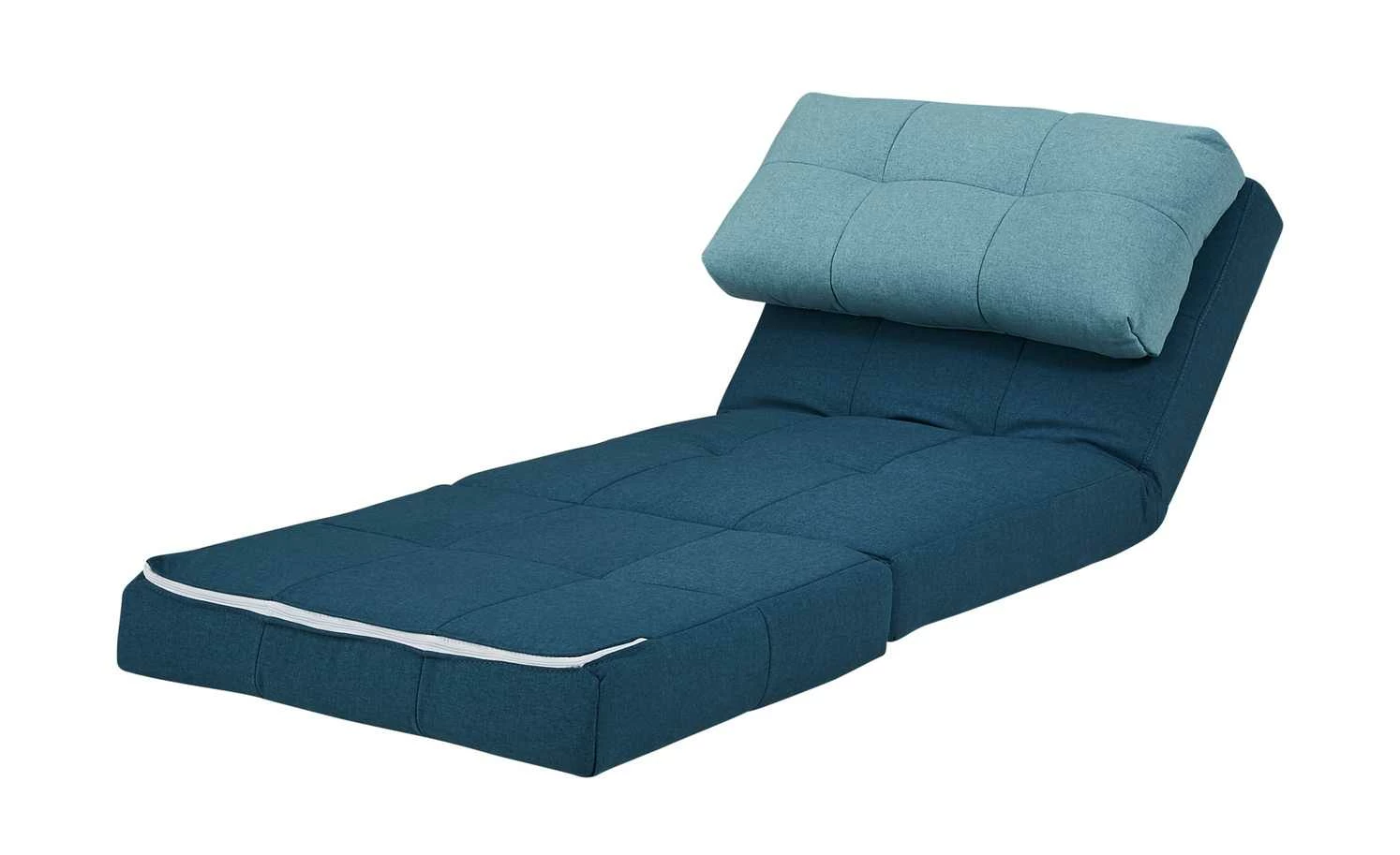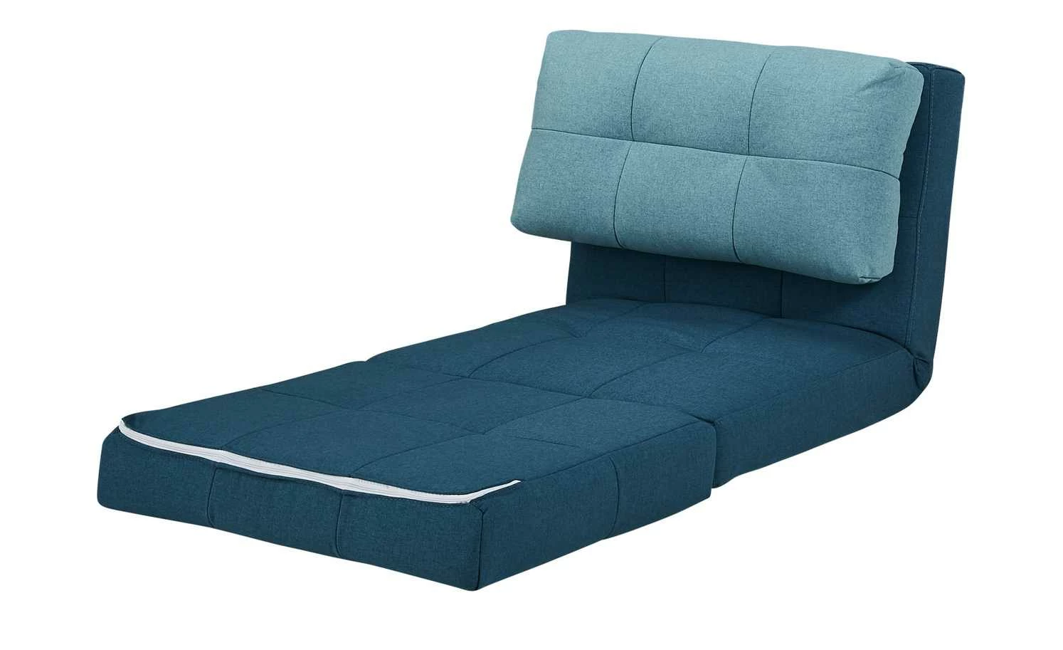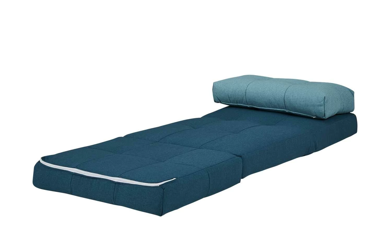 Becky ist Sessel, Liege und Schlafgelegenheit in einem. Das stabile, innenliegende Gestell aus massivem Eukalyptusholz ermöglicht das Verstellen des Sessels in diverse Positionen. Als Sessel können Kinder und Jugendliche bei einer Sitzhöhe von 31 Zentimetern bequem sitzen. Klappen Sie die weichen Schaumstoffpolster auseinander, wird Becky zur Relaxliege oder Liegefläche für Übernachtungsgäste. Der gesamte Schlafsessel ist mit petrolfarbenem Webstoff bezogen und kann dadurch frei im Raum platziert werden. Das Nackenkissen setzt sich in Türkis ab.