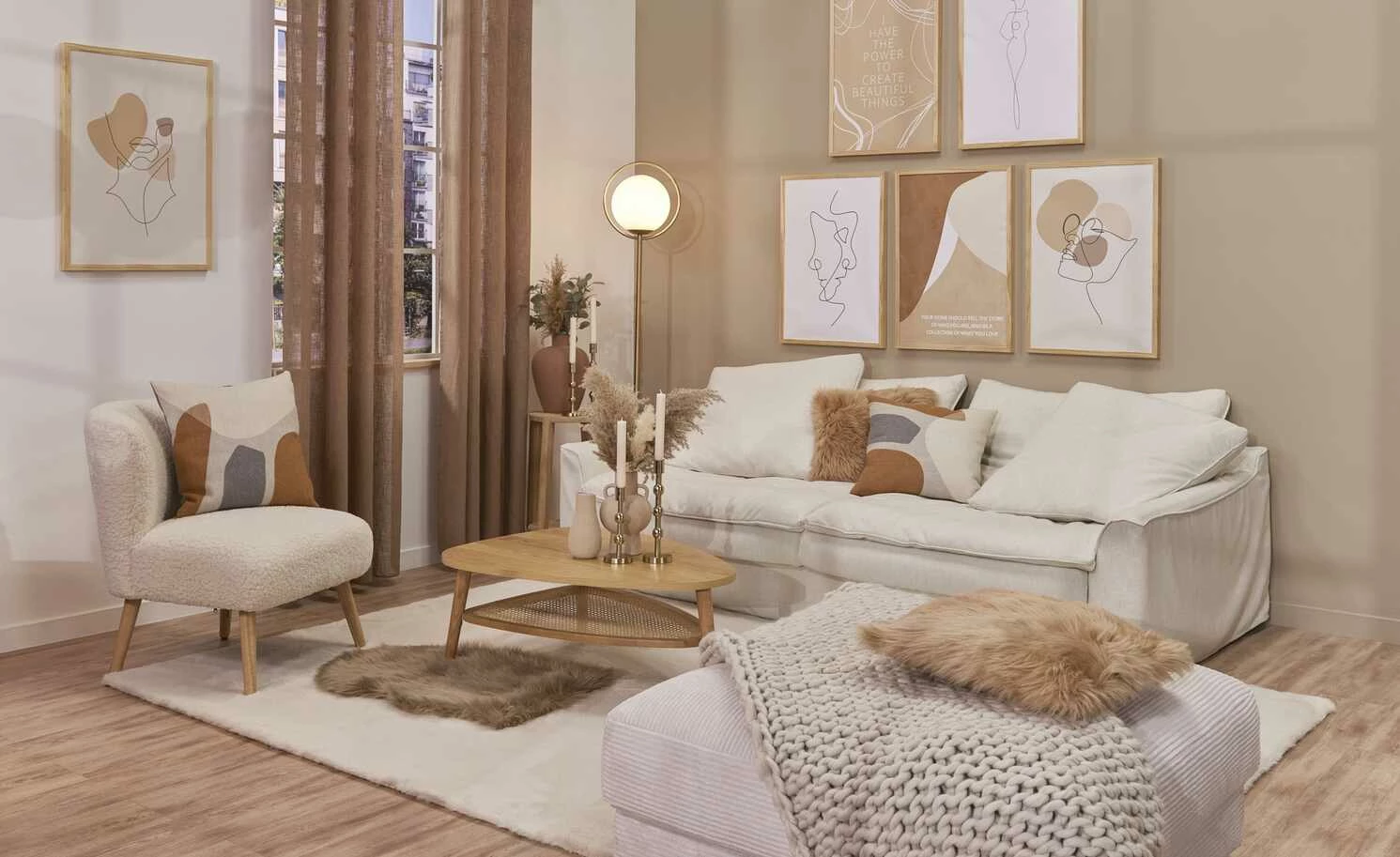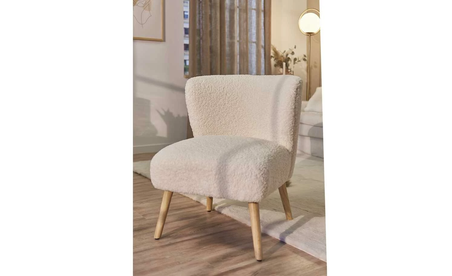 Kuschlig weiches Kunstfell und helle, freundliche Eichen-Massivholzfüße geben dem Sessel Thessa einen gemütlichen Scandi-Touch. Der beige Bezug umspannt die dick gepolsterte Sitzfläche und auch die halbrunde Rückenlehne. Der Sessel Thessa kann problemlos in vorhandene Raumkonzepte integriert werden und wird ganz leicht zum gemütlichen it-Piece in Ihren vier Wänden.