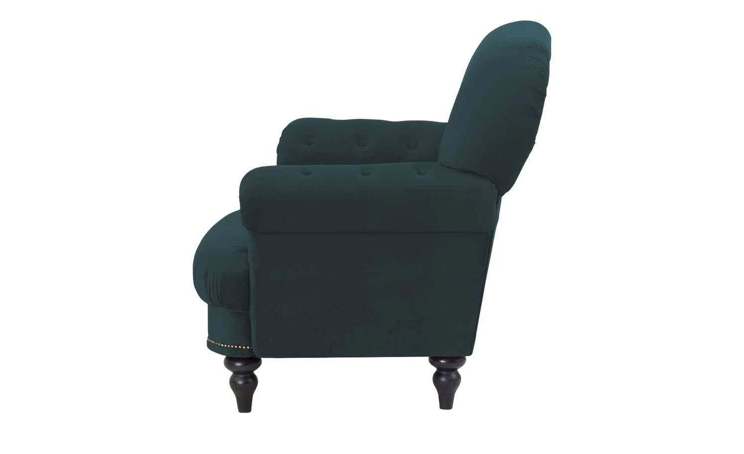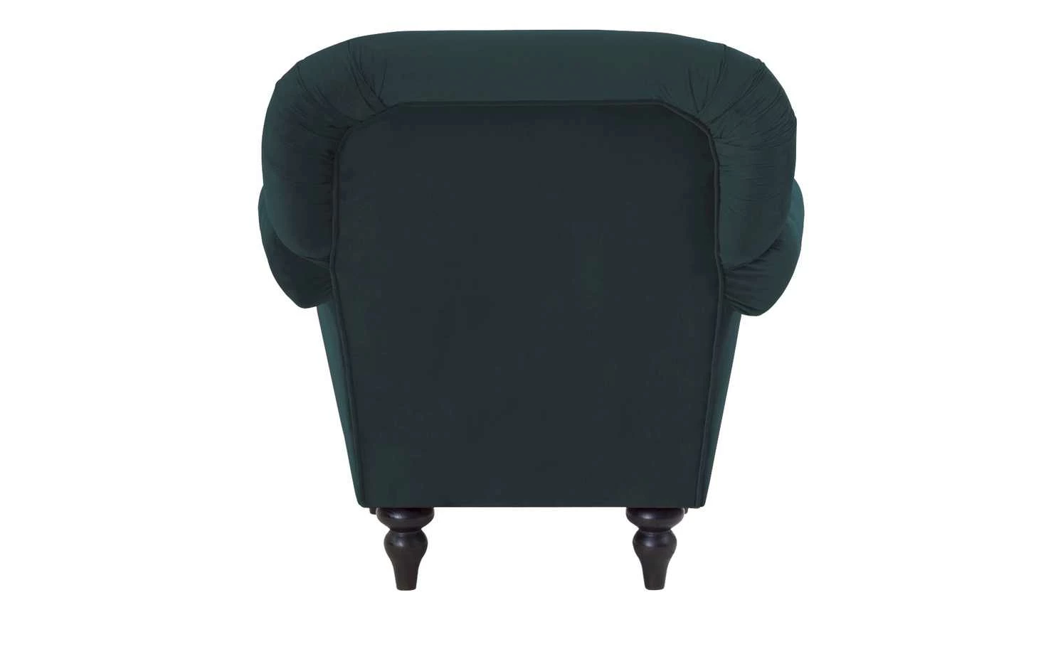 Der Sessel Sissi ist in seiner Gestaltung an den historischen Chesterfield-Stil angelehnt und strahlt Eleganz aus. Er ist an Armlehnen und Rückenlehne formschön abgesteppt und mit Zierknöpfen versehen. Weitere Akzente werden durch Metallnieten und die geschwundenen Holzfüße gesetzt. Diese sind aus massiver Kiefer und wengefarbig. Der dunkle Farbton passt gut zum Mikrofaserbezug. Dieser hat eine leicht samtige Optik, die zum Vintagestil des Sessels passt. Sitzbereich, Armlehnen sind weich gepolstert – der Sitzbereich außerdem mit einem Federkern ausgestattet.