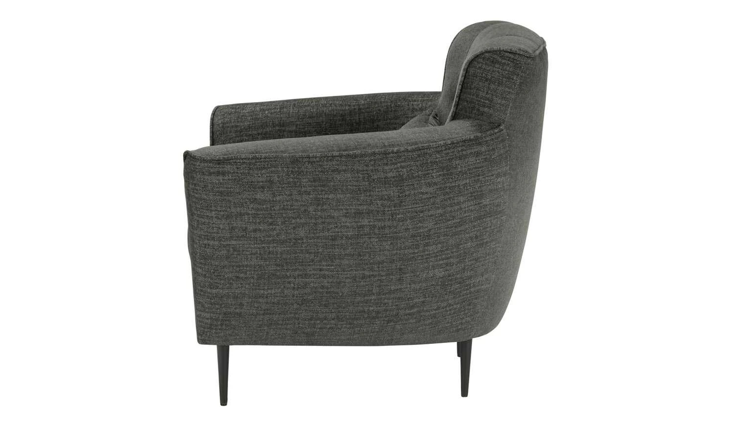 Bei diesem Sessel gehen Komfort, Nachhaltigkeit und Design Hand in Hand. Der einladende Sessel besitzt eine dicke, hochwertige Schaumstoffpolsterung und Armlehnen in Komforthöhe. Auch die dezent gesteppte Rückenlehne ist gepolstert. So können Sie sich entspannt anlehnen und den Abend mit einem Buch oder vor dem Fernseher genießen. Der strapazierfähige Bezug aus Flachgewebe besteht aus recycelten Materialien und harmoniert mit den schwarzen Metallfüßen.